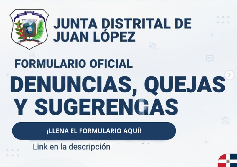 En la Junta Distrital de Juan López, estamos comprometidos con la transparencia y la participación ciudadana. Por eso, con la iniciativa de nuestro Alcalde Alberto González, hemos habilitado un Formulario Oficial de Denuncias, Quejas y Sugerencias para que puedas comunicarte directamente con nosotros.