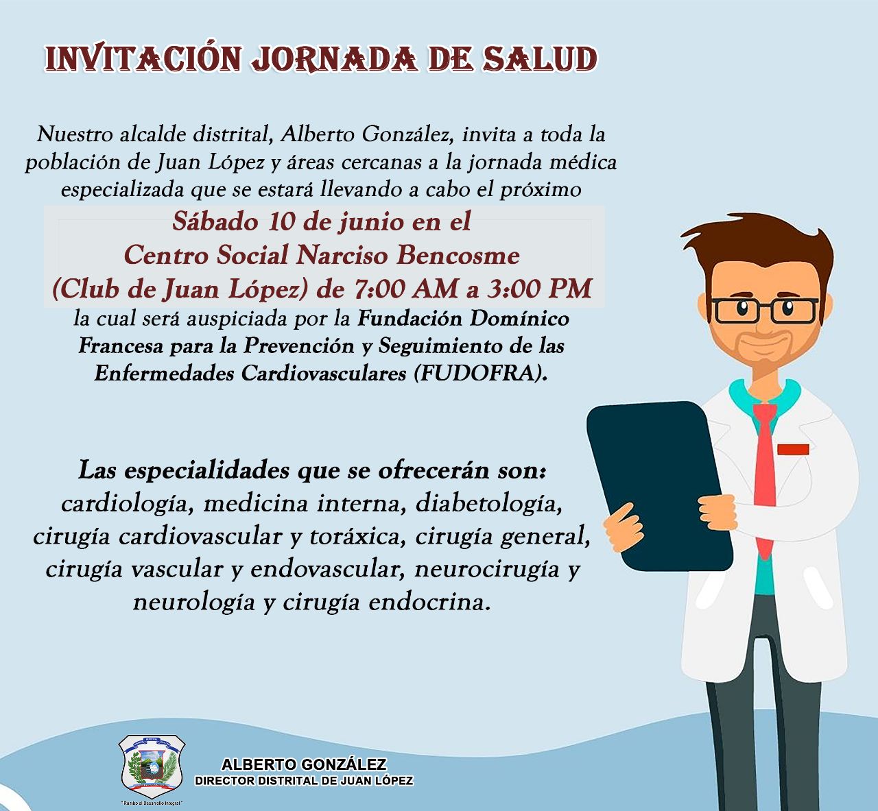 Nuestro Alcalde Distrital, Alberto González, invita a toda la población de Juan López y áreas cercanas a la jornada médica especializada que se estará llevando a cabo el próximo sábado 10 de junio en el Centro Social Narciso Bencosme (Club de Juan López) de 7:00 AM a 3:00 PM la cual será auspiciada por la Fundación Domínico Francesa para la Prevención y Seguimiento de las Enfermedades Cardiovasculares (FUDOFRA).